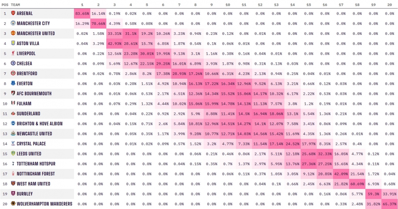 此外,伯恩利的降级概率为98.98%,西汉姆联的降级概率为68.38%,诺丁汉森林的降级概率为23.38%,利兹联降级概率为4.89%,热刺降级概率为4.45%。